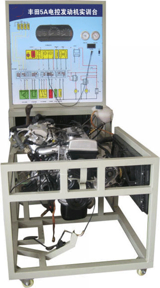 豐田5A-FE發動機總成、原車發動機控制電腦、組合儀表、防盜電腦、發動機起動運行所有相關的原車附件、故障設置和排除系統、原車電路原理圖板及檢測端子、60AH大容量蓄電池、大容量不銹鋼油箱、發動機加速機構、控制面板柜、可移動臺架、臺架電源總開關、OBD診斷座、散熱系統、任務驅動教學模式的實訓指導書及臺架操作說明書。
