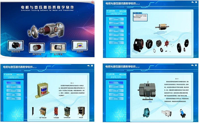 電機與變壓器仿真教學軟件依據《職業(yè)院校數字校園建設規(guī)范》(教職成函[2015]1 號)與教育部頒布的有關專業(yè)教學大綱而設計,選取典型的電機與變壓器,圍繞其核心知識點和技能點展開,兼顧教師的課堂教學,力爭達到軟件的職業(yè)性、情境性、過程性、交互性的相互交融。