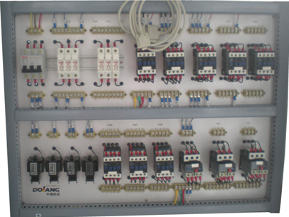 控制柜下部為機床電氣控制線路元器件布線區面板。面板上裝有低壓斷路器、直插式保險絲、交流接觸器、熱繼電器、控制變壓器等元器件,這些元器件直接安裝在面板表面,可以很直觀的看它們的動作情況,且都有相應的測試點,方便接線及故障考核檢測線路操作。