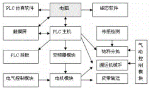 光機電一體化實訓(xùn)裝置由型材導(dǎo)軌式實訓(xùn)臺,典型機電一體化設(shè)備機械部件,PLC模塊,變頻器模塊,按鈕模塊,電源模塊,低壓電器模塊,模擬生產(chǎn)設(shè)備實訓(xùn)模塊(包含上料機構(gòu),搬運機械手,皮帶輸送線,物件分揀等)接線端子排,各種傳感器,警示燈和氣動電磁閥等組成。整體結(jié)構(gòu)采用開放式和拆裝式設(shè)計,學(xué)生可以組裝,接線,編程和調(diào)試由上料機構(gòu),搬運機械手機構(gòu),皮帶輸送線和物料分揀組成的光機電一體化設(shè)備。裝置的總體結(jié)構(gòu)示意圖如圖主所示。
