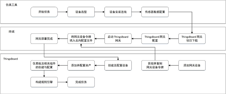 模擬智慧牧場系統還引入使用開源軟件平臺ChirpStack與ThingsBoard,結合LPWAN技術,實現遠程低功耗數據采集、上報和展示。在ChirpStack平臺上,用戶可對網關、GPS、溫濕度傳感器等設備進行配置,以上送仿真實驗中的虛擬數據。在ThingsBoard平臺上,設置牧場地圖、告警信息、溫濕度等各儀表盤組件;獲取仿真設備上送的數據,并將數據以圖表形式作可視化呈現;以及基于流式編程添加相應的規則策略,最終完成模擬智慧牧場實訓場景的部署搭建。
