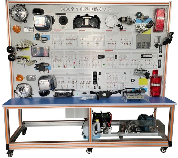 該設備采用全新BJ80 2.3T整車電器實物為基礎,充分展示汽車發(fā)動機防盜系統(tǒng)、儀表系統(tǒng)、燈光系統(tǒng)、雨刮系統(tǒng)、喇叭系統(tǒng)、點火系統(tǒng)、電動車窗系統(tǒng)、電動門鎖、音響系統(tǒng)、起動系統(tǒng)和充電系統(tǒng)等汽車電器各系統(tǒng)的組成結構和工作過程。