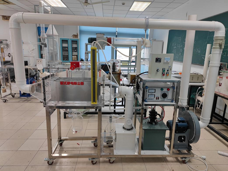 離心風機、旋風分離器、袋式除塵器、靜電除塵器、高壓靜電發(fā)生器、機械振打裝置、風量調(diào)節(jié)閥、發(fā)塵箱、集塵裝置、管路、U型壓力計、畢托管流量計、振動電機、電路控制柜、不銹鋼框架