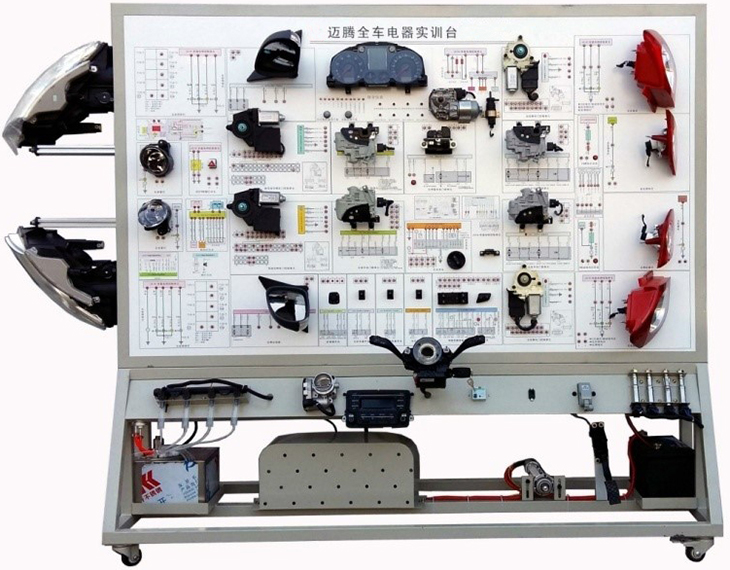 該設備采用全新邁騰B8L 2021款車身電器實物為基礎,充分展示汽車儀表系統、燈光系統、雨刮系統、喇叭系統、電動車窗系統、電動門鎖、音響系統、起動系統和充電系統等汽車電器各系統的組成結構和工作過程。