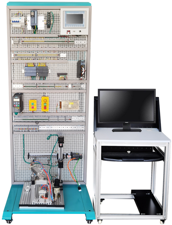 3)電氣控制系統開放式工業機架結構,含成套器件;面板采用網孔板形式,4 只萬向輪(2 只帶剎車)。可將 PLC、電源、變頻器、觸摸屏等安放在該平臺上,配有空氣開關、接線端子、電纜線、輔料,接地可靠,設有漏電等保護裝置,安全性符合相關的國標標準,保護學生在實訓過程中的安全性。采用工業規范制作,所有接線有標號,便于實訓和日常維護。
