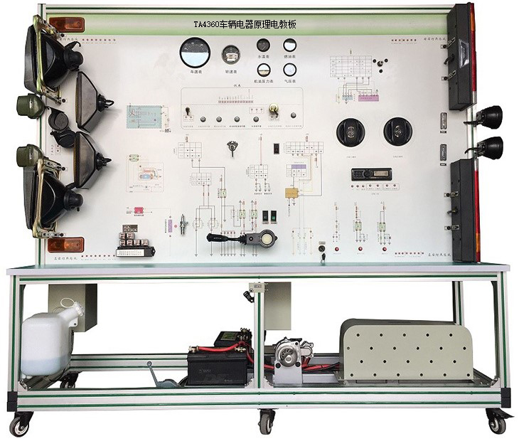 該設(shè)備采用泰安TA4360柴油機(jī)整車電器實(shí)物為基礎(chǔ),充分展示汽車儀表系統(tǒng)、燈光系統(tǒng)、雨刮系統(tǒng)、喇叭系統(tǒng)、發(fā)動(dòng)機(jī)電器系統(tǒng)、起動(dòng)系統(tǒng)和充電系統(tǒng)等汽車電器各系統(tǒng)的組成結(jié)構(gòu)和工作過程。
