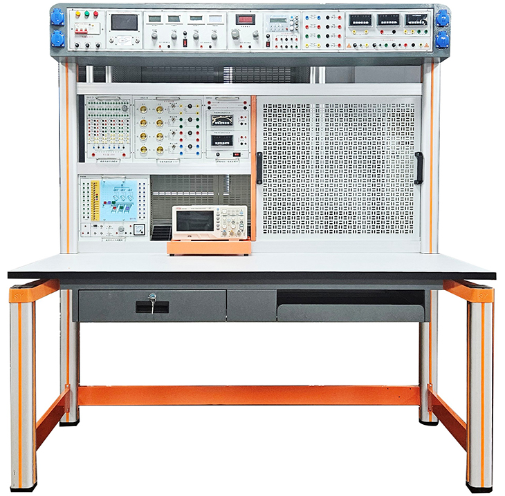 實驗桌后面二支桌腳向上延伸,配上特制拉模成型的帶滑槽橫梁鋁型材組成實訓屏,實訓時左邊放置電氣實訓掛箱(2層)及示波器支架,右邊裝置網孔板等,實訓掛箱、網孔板在實訓屏上實訓時上下方便,左右移位自如。實訓屏頂部安裝主機箱,實訓屏底部安裝實驗儀器工作電源箱。