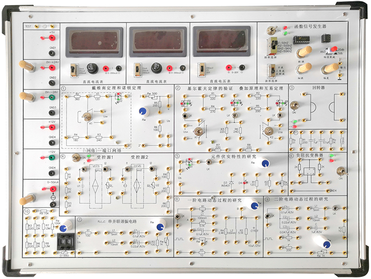 由鋁木合金材料制作箱體,無任何污染源,箱體內(nèi)含直流穩(wěn)壓工作電源、實(shí)驗(yàn)用恒流源和恒壓源、測量用直流電流表、直流電壓表、實(shí)驗(yàn)電路模塊區(qū)等組成。