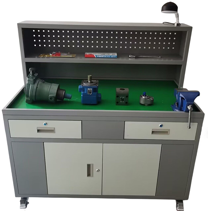 6、實訓臺:采用鈑金結(jié)構(gòu)設計,表面為雙層亞光密紋噴塑工藝處理,臺面采用下凹設計,增加臺虎鉗,以及絕緣防滑墊,同時為液壓閥拆裝時提供一個良好的接油、防震平臺。